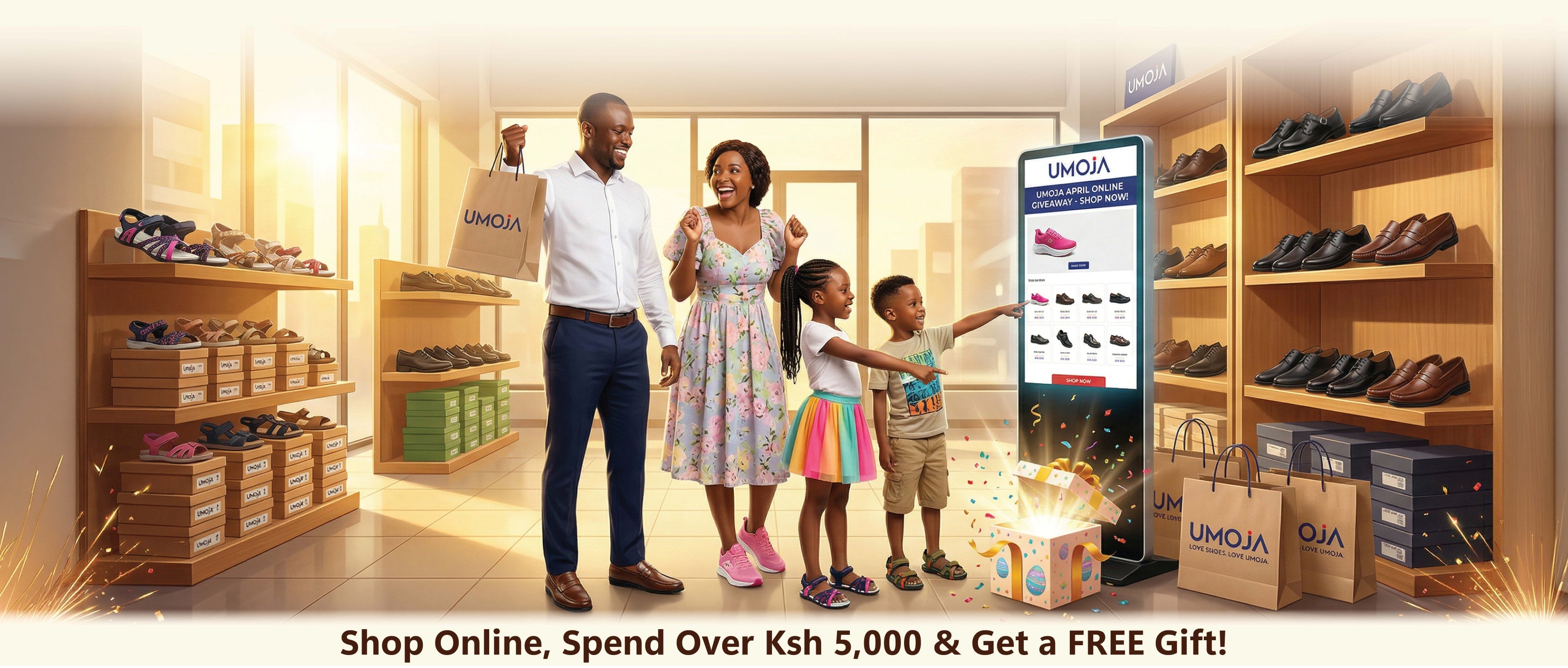 This April, experience the joy of discovery as our latest Umoja shoe emerges from a glowing Easter egg — a symbol of gifting and celebration. Just like the thrill of opening a present, shopping online with Umoja brings you closer to surprises that elevate your style. Every shopper who spends over KSh 5,000 unlocks a chance to win in our special giveaway. Celebrate the season with comfort, elegance, and the excitement of something new — delivered straight to your doorstep.